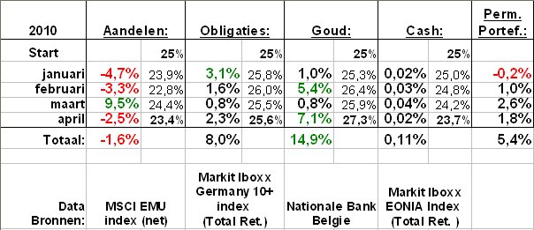 De permanente portefeuille voegt +1,8% toe en staat nu op +5,4% in 4 maanden tijd nadat het in 2009 +13% had en in het rampjaar 2008 slechts -2% verloor. Zeker niet slecht maar ook niet fantastisch gezien de euro die elke dag in waarde daalt en de inflatie weer stijgende is. Maar met dergelijke rendementen blijft onze koopkracht wel behouden en neemt ze zelfs langzaam maar zeker toe, in tegenstelling tot de vele spaarrekeningen en traditionele gespreide portefeuilles die in 2010 weer niet bijblijven met de inflatie door een gebrek aan goud in de portefeuille (dit geldt nu ook voor vastgoed).