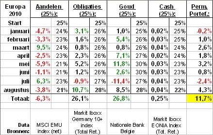 De zomervakantie zit er op en het was weer heerlijk achterover leunen. Obligaties zijn enorm toegenomen in waarde en hebben nu ook +26% rendement in 2010, evenveel als goud. De Permanente Portefeuille profiteert ervan en voegt in augustus een knappe +4,3% toe. We tikken +11,6% voor 2010. Vorig jaar, in 2009, had de PP+13%. In rampenjaar 2008 had de PP slechts -2% verlies.