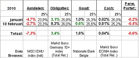 Aandelen zijn het jaar slecht begonnen met een daling van -7,3%. Goud steeg 1,6% en de Duitse staatsobligatie, desondanks of misschien dankzij de vlucht uit de Griekse staatsobligatie, ging een stevige +3,4% hoger waardoor de permanente portefeuille de schade wist te beperken met een verlies van -0,6%.