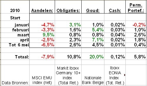 Hier de rendementen van de permanente portefeuille en zijn activa tot gisterenavond: