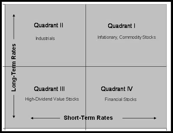 Er zijn vier kwadranten. U kunt dan zien bij welk kwadrant welke soort aandelen favoriet zijn. Uiterst rechts zijn zowel de lange rente als de korte rente stijgend. Daarbij zijn dus vooral grondstofaandelen favoriet. Bij kwadrant III zijn ze beide dalend: waarde aandelen zijn in trek. Bij kwadrant IV stijgt de korte rente maar daalt de lange rente: de yield curve vervlakt en financiële aandelen zijn dan geliefd.