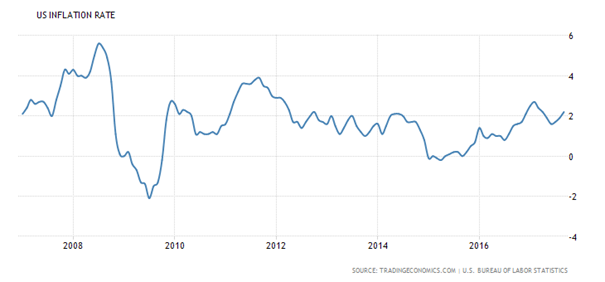 De centrale bankiers klagen steen en been over het feit, dat de inflatie structureel onder de 2% blijft. Echter, laten we nu eens de onderstaande grafiek van de Amerikaanse inflatie bekijken.