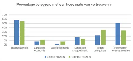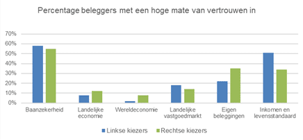 31% van de ondervraagden neemt hun beleggingsportefeuille mee in de beslissing op wie ze gaan stemmen. Van deze groep doen beleggers die zichzelf politiek identificeren als rechts van het midden, dit vaker dan beleggers die zich op het politieke spectrum links van het midden plaatsen (39% versus 24%). Ook komt uit het onderzoek naar voren dat 35% van de rechtsgeoriënteerde ondervraagden een hoge mate van vertrouwen (op een schaal van 4) heeft in de eigen portefeuille tegen 22% van de linkse stemmers. Dat komt overeen met het vertrouwen in de economie. Gemiddeld genomen zijn rechtse kiezers iets minder negatief over de staat van de Nederlandse- en wereldeconomie.