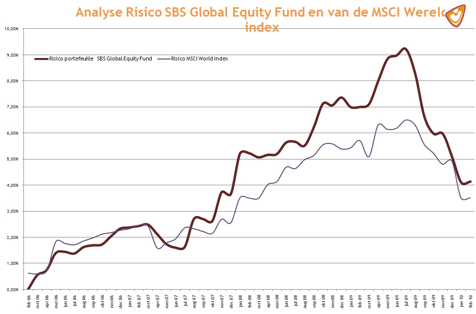 De cruciale vraag omtrent de prestaties van dit fonds is dan ook het risico dat beleggers in dit fonds hebben gelopen. Om hier een uitspraak over te doen, heb ik het risico van de msci-wereld index en van het SBS Global Equity Fund in een grafiek geplaatst. Er wordt namelijk beweerd dat men in staat is om meer rendement te realiseren met minder risico. We hebben al geconstateerd dat de eerste uitspraak in de praktijk niet is gerealiseerd. Daarom kijk ik nu naar het risico.