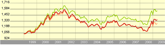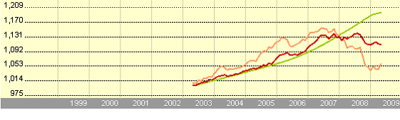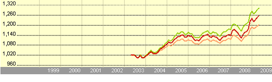 In de onderliggende fondsen is inmiddels flink geschoven vanwege het opgaan van ABN AMRO Asset Management in Fortis. De aandelenfondsen presteren conform of licht onder de benchmark. De obligatiefondsen echter, presteren behoorlijk ondermaats. De rode lijn geeft het fonds weer, de groene lijn is de index. (bron : Morningstar).