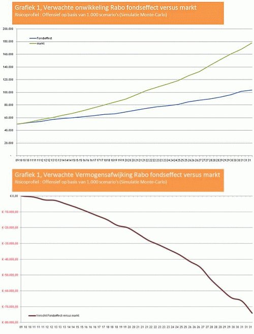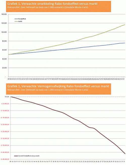 Het antwoord of Rabo Fondseffect toegevoegde waarde heeft voor een belegger moet ik helaas negatief beantwoorden. Ik vrees dat beleggers die van dit serviceconcept gebruik (gaan) maken een rendement gaan realiseren dat waarschijnlijk ver achterblijft bij het rendement van de markt. Op basis van zeer realistische scenario’s heb ik berekend dat over een lange periode het uiteindelijke vermogen mogelijk 41 % lager uitvalt dat als de belegger een marktconform rendement zou weten te realiseren.