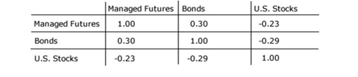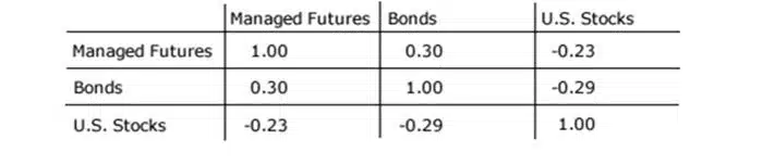 De combinatie van traditionele beleggingsklassen met managed futures en of commodities verlagen door hun geringe onderlinge correlatie de volatiliteit. Door die geringe correlatie stijgt de kans op een beter beleggingsresultaat.