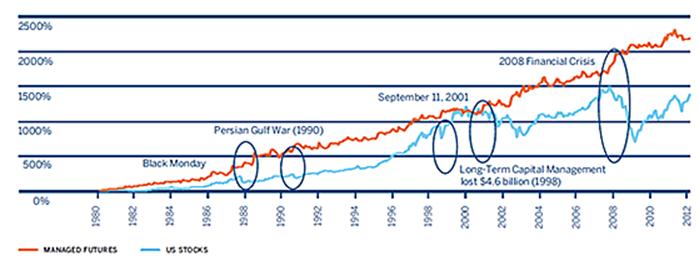 Het is bijna een wetmatigheid dat bij een koersstijging van de ene beleggingsklasse koersen van andere klassen dalen. Omdat Managed Futures beleggen over een breed spectrum van vermogenstitels, zijn ze amper of niet gevoelig voor deze wetmatigheid. Managed futures verminderen zodoende de volatiliteit van uw beleggingsportefeuille en verhogen de solide rendementen over de lange termijn.