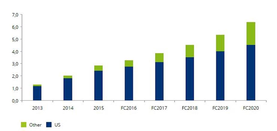 Figuur 4 Verwachtingen omtrent cyber insurance markt tot 2020 (⬠mrd.)