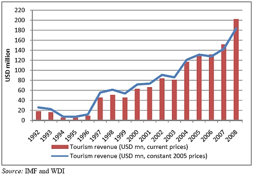 Rwanda inkomsten uit toerisme, 1992-2008.