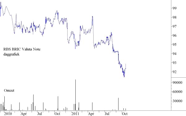 Vorige week hebben wij aandacht besteed aan de lange termijn ontwikkeling van deze valuta tegenover de € met het oog op een product dat wij onlangs tegenkwamen waarmee wel in deze valuta belegd kan worden, namelijk de RBS BRIC Valuta note. Dit is niet de enige manier waarop in BRIC-valuta belegd kan worden. Er zijn trackers, wij hebben vorige week al de valutarekeningen genoemd, men kan termijncontracten gebruiken en er zijn meer obligatieproducten zoals de note die wij hier willen bespreken. Een aantal van deze producten zullen wij wellicht in een volgend artikel behandelen. Maar wij beginnen met deze specifieke note vanwege het relatief beperkte risico dat eraan verbonden is.