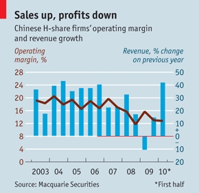 Maar er zijn ook kritische geluiden te horen. Zo wijst The Economist (9 december) erop dat de omzet van de Chinese bedrijven fors blijft groeien (23% in de tweede helft van 2010), maar dat de marges blijven dalen. Zie grafiek: