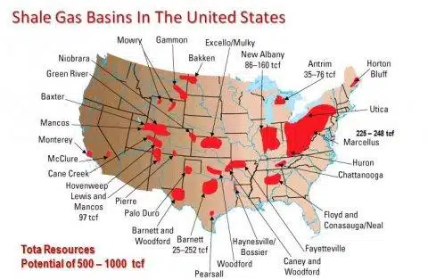 Alle tot nu toe gevonden schaliegas velden in de Verenigde Staten