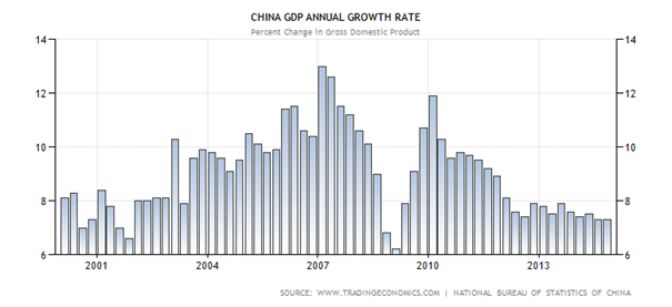 Januari en februari 2015 hebben een aanzienlijke verzwakking van de reële economische groei laten zien. In de eerste twee maanden steeg de industriële productie met 6,8% jaar-op-jaar, het laagste groeicijfer sinds 2008. Als de financiële crisis buiten beschouwing wordt gelaten. is het zelfs de laagst groei sinds 1995. Tegelijk werd bekend dat de toename van het BBP in volumetermen in 2014 met 7,4% – volgens de officiële cijfers – de laagste was in een kwart eeuw. Voor 2015 verwacht premier Li Keqiang een cijfer van rond de 7%. Lagere groei is de “new normal”.