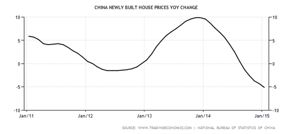 Deze brede groeivertraging wordt mede veroorzaakt door een serieuze teruggang in de tot voor kort oververhitte onroerend goed sector. Verkopen en prijzen dalen hier al geruime tijd. De huizenverkopen daalden in de eerste twee maanden van 2015 met 16,3%. De prijzen van nieuwe huizen dalen in alle grote steden: zie grafiek.