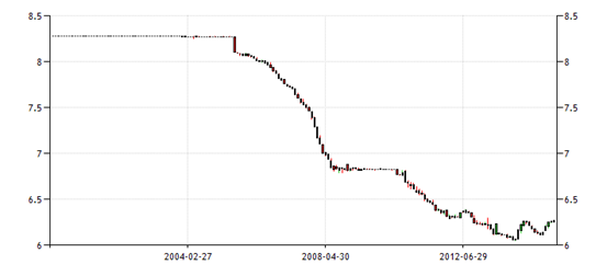 Grafiek: aantal renminbi’s per usdollar. Bron: Trading Economics