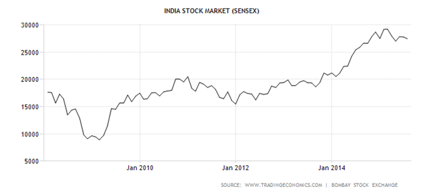 Deze en andere cijfers hebben een enorme stimulans aan de Bombai Stock Exchange gegeven. In het verkiezingsjaar 2014 steeg de Sensex (BSE30) 28,5%; dit jaar blijft de teller steken op 1,2%.