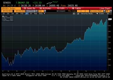 Indiase aandelen zijn het afgelopen jaar sterk gestegen. Bron: Bloomberg