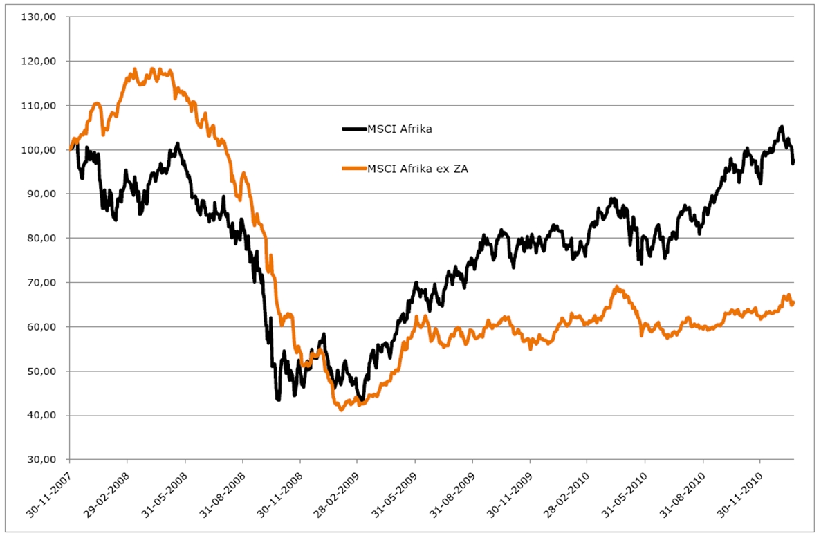 Beleggers die op het Afrikaanse continent wensen te beleggen hebben veelal de keuze om dit te doen op basis van een belegging die grotendeels is gebaseerd op het EM deel van Afrika namelijk Zuid Afrika, of dat wordt gekozen voor de FM op het continent. De MSCI construeerde voor beide beleggers een tweetal referentie-indexen; de MSCI Afrika (inclusief Zuid-Afrika) en MSCI Afrika (exclusief Zuid-Afrika). De grafiek hieronder laat zien dat de emerging markt Zuid-Afrika, die op het continent een aandeel van ongeveer 75% in de totale marktkapitalisatie heeft, een enorme stempel op de prestatie van de MSCI Afrika drukt. Ook de sterke stijging van de Zuid-Afrikaanse rand droeg hier de afgelopen 2 jaren aan bij (+52% t.o.v. de euro). De MSCI Afrika exclusief Zuid-Afrika blijft dan ook duidelijk achter. De waardering van de laatstgenoemde index zijn mede hierdoor aantrekkelijk, maar er is meer.