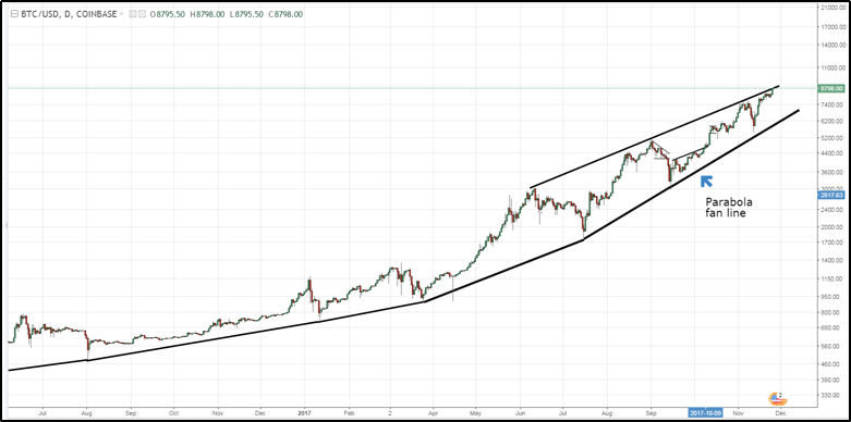 Parabolisch omhoog, daaraan alleen al zul je je zorgen moeten maken, en al helemaal als dit in 5 bewegingen heeft plaatsgevonden zoals bij Bitcoin.