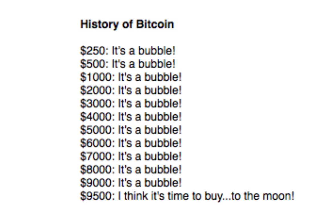 We kijken in de lucht. Is het een Noord-Koreaanse raket? Nee, het is Bitcoin ! De digitale munt weet van geen ophouden en begint steeds sneller te stijgen. Vandaag werd de $11.000 al aangetikt. En iedere keer zijn er sceptische commentaren. Zijn dat waarschijnlijk degenen die de boot gemist hebben ? Er wordt telkens gesproken dat BItcoin een zeepbel is die op knappen staat. Zie onderstaande tabel.