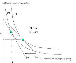 De gevolgen van deze voorselectie van te belasten grootheden zijn met behulp van een eenvoudig gedachten experiment duidelijk te maken. De lijnen P1 en P2 geven in de onderstaande grafiek productieniveaus weer die met verschillende combinaties van grondstoffen enerzijds en arbeid, kapitaal en grond anderzijds kunnen worden voortgebracht bij een gegeven stand van de techniek. Daarbij geldt dat P1>P2. K1 en K2 geven combinaties met gelijke kostenniveaus weer doch bij verschillende prijzen van arbeid, kapitaal en grond. Door belastingen op toegevoegde waarde zijn de kosten van arbeid etc. hoger bij K2. Bij een zelfde kostenniveau kan dan minder (P2<P1) worden geproduceerd. Daarnaast leidt het duurder maken van arbeid, kapitaal en grond tot een verschuiving van de uitgaven richting grond- en hulpstoffen en een daling van de gebruikte hoeveelheden arbeid, kapitaal en grond. Behalve een terugloop van het haalbare niveau van de productie (P2<P1), neemt ook de reële toegevoegde waarde zelf af door de heffingen op de toegevoegde waarde of delen daarvan.