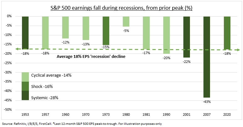 - Cyclische recessies komen het meeste voor. De centrale bank verhoogt de rente om een stijgende inflatie het hoofd te bieden. Gemiddeld genomen duren deze recessies tien maanden met een verschil in economische groei tussen ‘de piek’ en ‘het dal’ van 2% op jaarbasis en een daling van de bedrijfswinsten van 14%.