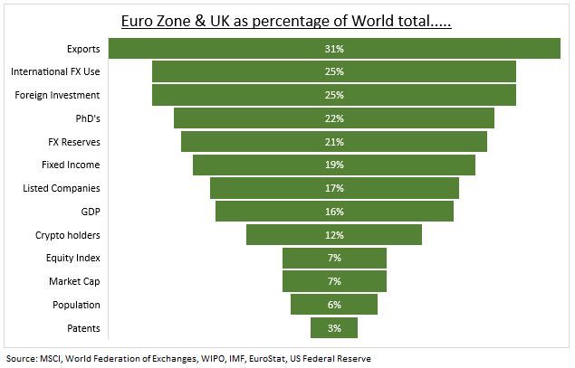 Europa en het Verenigd Koninkrijk samen vormen de op twee na grootste economie ter wereld. De regio is een van de grootste exporteurs en een van de grootste investeerders (zie grafiek). De Europese Unie is de belangrijkste handelspartner voor 80 landen wereldwijd. Ter vergelijk: de Verenigde Staten is dat voor 20. Een vertraging van de economie in Europa zal dan ook breed gevoeld worden. De economische slagkracht doet de relatief kleine bevolking en aandelenmarkten in het niet vallen. Met 440 miljoen vermogende consumenten is Europa de grootste hoop voor overzeese Amerikaanse en Chinese bedrijven.