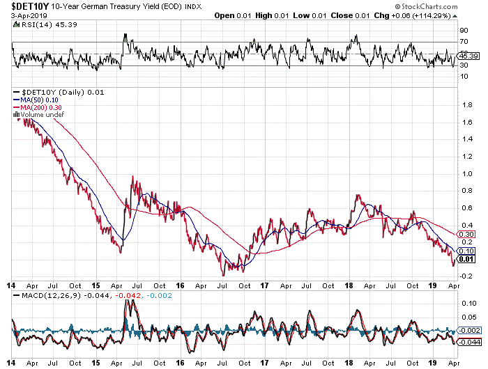 Japan en Duitsland zijn nu in een race verwikkeld voor de prijs van staatsobligaties met de grootste vergoeding. Japan leidt deze onzalige race, maar gevreesd moet worden dat Duitsland wel eens een nationaal record kan breken. In 2016, op het hoogtepunt van de discussie over secular stagnation, bereikte de vergoeding op de 10jaars Bund een dieptepunt van -0,19%. De yield heeft dit jaar -0,07% aangetikt.
