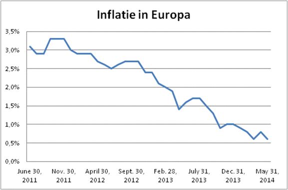 Afgelopen drie jaar daalde de Europese inflatie van 3,3% naar 0,6% in mei 2014. Het zijn slechts drie jaar uit een veel grotere beweging. Sinds 1980 daalt de inflatie. Toen nog 12%- 13%, nu dus dichtbij het nulpunt.