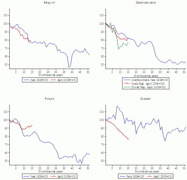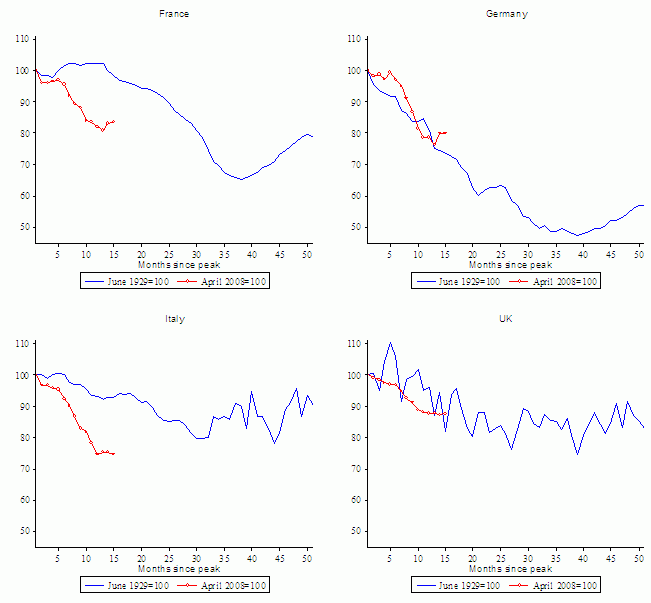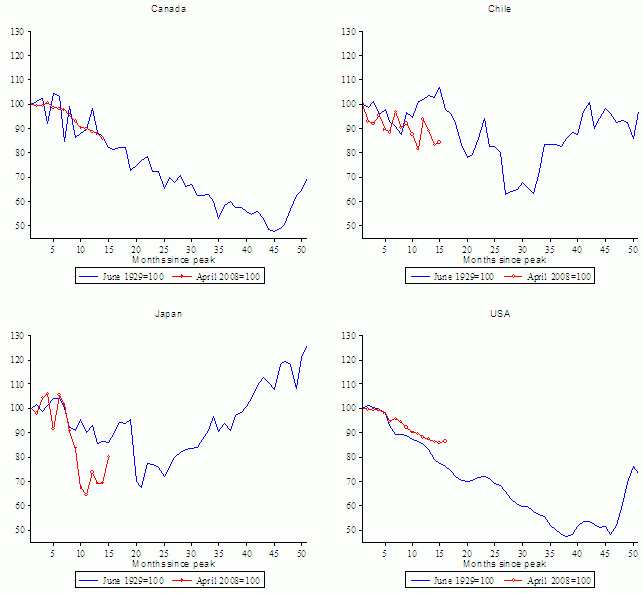 Op basis van hun recente cijfers (tot en met juni 2009) zijn nu duidelijke tekenen van het herstel van de wereldwijde productie te zien. Dit is een scherpe afwijking van de ervaringen tijdens de Grote Depressie. De daling hield destijds drie jaar aan. (zie onderstaande grafiek)