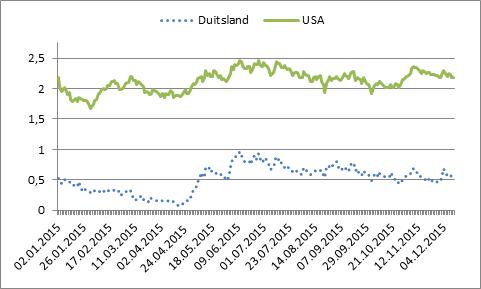 In dat geval zal er in ieder geval in 2016 sprake zijn van divergentie tussen Amerika en Europa. Ik verwacht dan toch maar kleine gevolgen voor de dollar (de grote stijging heeft al in 2015 plaatsgevonden). En ondanks de opkoopoperaties van de ECB zal de kapitaalmarktrente in Europa aan elastiekje met omhoog worden getrokken met de Amerikaanse rente.