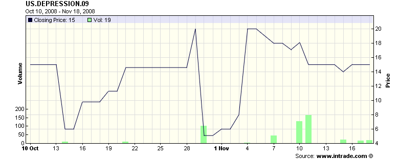 Lopende weddenschappen op intrade.com houden rekening met een kans van 15% op een depressie in de Verenigde Staten volgend jaar.