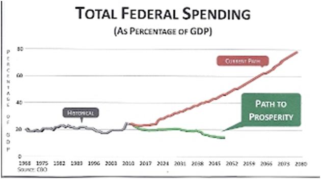 Al langer wordt om een consistent plan gevraagd om de schuld op middellange termijn onder controle te brengen. Republikeins Congreslid Paul Ryan heeft de handschoen opgenomen en een paper hierover uitgebracht. In “Path to Prosperity” formuleert hij een forse doelstelling: er moet voor $ 6200 mrd worden bezuinigd, zodat de heilloze weg van schuldstijging wordt doorbroken. De rentebetalingen op de uitstaande schuld – 5,2% van de totale uitgaven in 2010 – zouden uiteindelijk alle ruimte in de begroting opsnoepen.