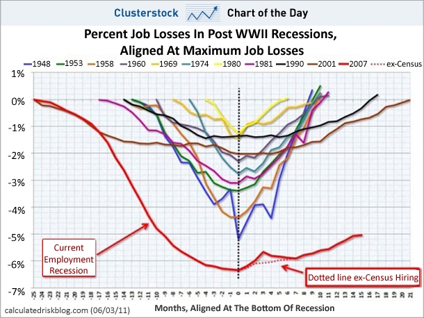 Al met al wordt mij niet duidelijk waar een groeiversnelling vandaan moet komen. Het grote probleem blijft  de werkloosheid. In vergelijking met andere post-recessieperiodes worden er veel te weinig banen geschapen: zie grafiek.