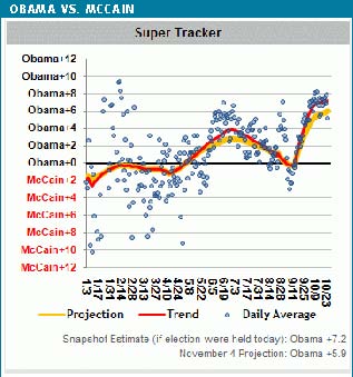De polls, zie de grafiek, liegen er inderdaad niet om: een duidelijke voorsprong voor Obama. En toch is het antwoord op uw vraag: neen. Die polls zijn namelijk het gevolg van iets anders, namelijk van de effectenbeurs.