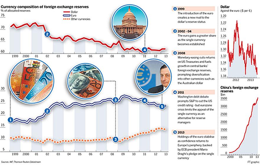 Volgens het IMF is de neiging van centrale banken om meer te gaan diversifiëren niet van vandaag of gisteren. Bij het IMF zien ze al vanaf het 2de kwartaal van 2012 deze trend sterker worden. Dat zou de huidige kracht van het Britse pond en de euro kunnen verklaren. Uit de IMF gegevens spreekt ook een groeiende populariteit van de Canadese en Australische dollar en de Zwitserse franc. Dat is allemaal onvoldoende om op korte termijn de dominantie van de dollar te breken, maar die positie erodeert desondanks. De trend is gezet en die zal alleen maar sterker worden. De VS hebben ook deze keer weinig oog gehad voor de belangen van de rest van de wereld. Vooral China draagt hen die houding zeer na. Ze pleiten daarom zeer nadrukkelijk voor een de-amerikanisering van de wereld, te beginnen met de rol van de dollar als reservemunt.