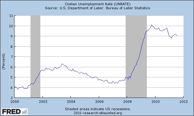 Met een werkloosheidspercentage van boven de 9% (zie grafiek)  en een verkiezingsjaar in het vooruitzicht moet president Obama iets doen. De Fed kan hem nu niet meer helpen, dus het zal van de overheid moeten komen of uit het buitenland (Help us, oh mighty China!). Maar om verschillende redenen zal daar de redding niet vandaan komen.  Meer dan een “shout” van teleurstelling en een twist dance op het feestje van zijn opvolger zit er voor Obama waarschijnlijk niet in.