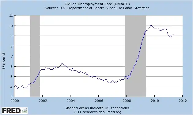 Met een werkloosheidspercentage van boven de 9% (zie grafiek) en een verkiezingsjaar in het vooruitzicht moet president Obama iets doen. De Fed kan hem nu niet meer helpen, dus het zal van de overheid moeten komen of uit het buitenland (Help us, oh mighty China!). Maar om verschillende redenen zal daar de redding niet vandaan komen. Meer dan een “shout” van teleurstelling en een twist dance op het feestje van zijn opvolger zit er voor Obama waarschijnlijk niet in.