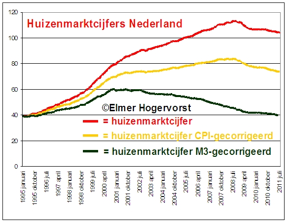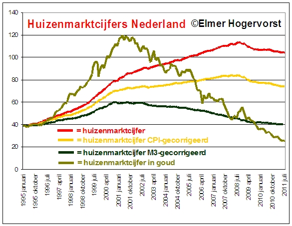 Sinds januari 1995 steeg het voor M3 gecorrigeerde huizenmarktcijfer van 39 naar een top op 60 in december 2000. Dat is 53% in 6 jaar tijd. Echter, sinds eind 2000 is de index gedaald naar de meest recente koers van…..39! Met andere woorden: de huizenmarkt is in 16,5 jaar flink in PRIJS gestegen maar geheel niet in WAARDE! Zie hier het effect van het bijdrukken van geld. We rekenen in euro’s en wanen ons schatrijk. We beseffen daarbij niet dat deze rekeneenheid aan continue waardevermindering onderhevig is. We kijken enkel naar de prijs en strooien onszelf eurozand in de ogen. In werkelijkheid is er geen stuiver bijgekomen in onze vermogenspositie.