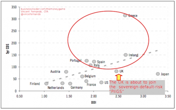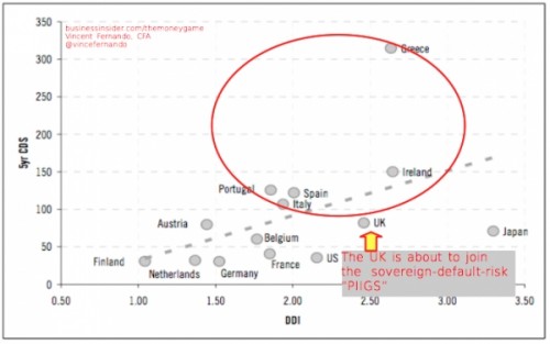Portugal, Italië, Ierland, Griekenland en Spanje (PIIGS) staan aan de rand van faillissement. Binnenkort moet een andere afkorting gebruikt worden want het VK is snel aan hun zijde aan het scharen.