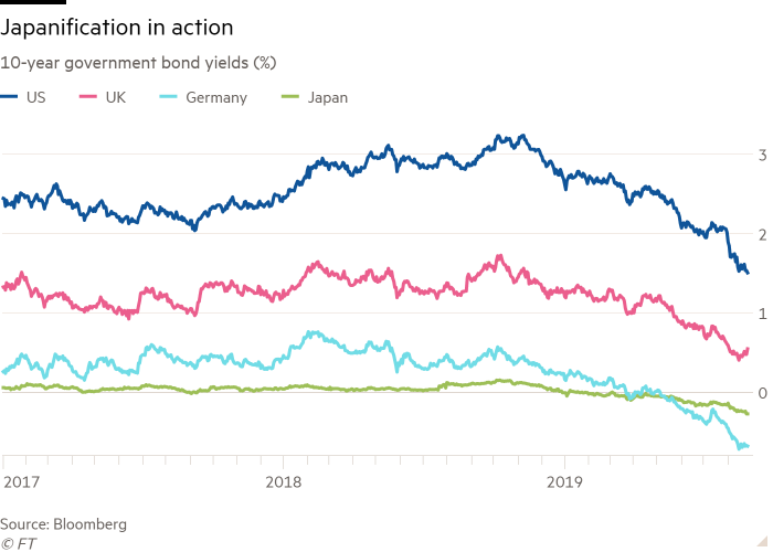 De vrees leeft al langer, dat Europa vroeg of laat dezelfde weg op zal gaan, maar nu vat het idee post dat zelfs de VS aan Japanificatie ten prooi kan vallen. De inflatie blijft ook in dat land hardnekkig laag, terwijl de effecten van de belastingverlaging al nagenoeg opgedroogd zijn. En nu begint de FED opnieuw de rente te verlagen, waarmee een Japan scenario dreigt te ontrollen. Voeg daar de handelsoorlog aan toe en Japanificatie kan zich op wereldschaal gaan voordoen.