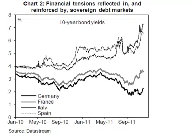 De onmacht om de crisis in deze economisch belangrijke landen te bezweren kreeg geleidelijk een negatieve invloed op heel de eurozone. In eerste instantie kwam Frankrijk onder vuur te liggen. Ook daar begon de lange rente op te lopen, maar inmiddels kunnen kernlanden als Nederland en Duitsland zich niet meer aan de malaise ontrekken. De reden is, dat beide landen ook deel uit maken van de eurozone en zo deel van het probleem zijn. Het zou overigens niemand mogen verbazen indien Nederland zich in 2012 mag verheugen in de bijzondere aandacht van de internationale obligatiemarkten. Nederland heeft immers de hoogste hypothecaire schuld per hoofd van de bevolking ter wereld en veel huiseigenaars dreigen kopje onder te gaan.