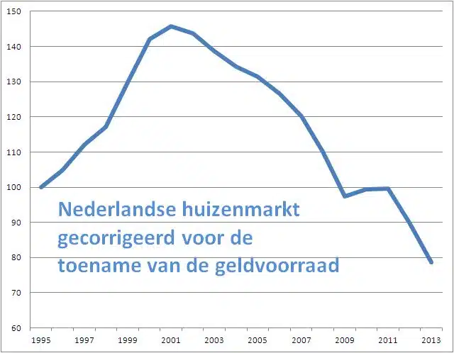 Wanneer we huizenprijzen en andere prijzen corrigeren voor de echte geldontwaarding dan blijken we een stuk minder rijk te zijn dan we dachten. Elimineren we de groei van de geldhoeveelheid uit de huizenprijzen, dan staat de gemiddelde huizenprijs in 2008 niet 150 procent hoger dan in 1995, maar op ongeveer hetzelfde niveau als bij de aanvang van de publicatie in 1995. De prijs mag dan flink gestegen zijn, de waarde is in die dertien jaar per saldo onveranderd gebleven. En anno 2013 staat de huizenprijsindex zelfs 22 procent lager dan 18 jaar geleden.