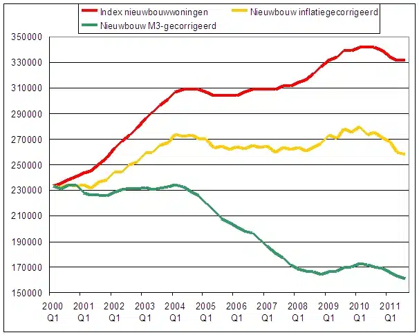 De index zoals het CBS die publiceert zegt dat ultimo 2002 de prijs 110 bedroeg en nu 131. Een simpele rekensom laat zien dat op basisvan de indexeen nieuwbouwwoning in 2011 131/110 x 233.000 euro = 277.481 euro kost. Het verschil bedraagt 44.000 euro en geen ton zoals het persbericht zegt. Zou het soms gebaseerd zijn op een individueel voorbeeld en niet op het gemiddelde van het CBS? Het persbericht zegt toch echt dat het om ‘de gemiddelde prijs’ gaat. Hoe dan ook, ik heb de periode wat uitgebreid om meer in de buurt tekomen van hetgeenhet persbericht stelt. Daartoe heb ik de prijsindex vanaf januari 2000 genomen. Deze stond toen op 92. Een nieuwbouwwoning die 233.000 euro in januari 2000 zou kosten kan op dit moment worden gekocht voor (131/92 x 233.000=) 331.771 euro. Daar zien we ongeveer een ton verschil.