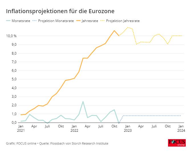 Voor de VS zou dit betekenen: vanaf oktober 2023 zou de jaarlijkse waarde weer 7,8 procent bedragen. In de eurozone daarentegen zal “een basiseffectpiek van de inflatie waarschijnlijk op handen zijn”, aldus Duarte. Dus als de maandelijkse HICP op het gemiddelde van 0,80 procent zou blijven, zou de inflatie in januari oplopen tot 11,0 procent, daarna dalen en zich stabiliseren rond de 10 procent.