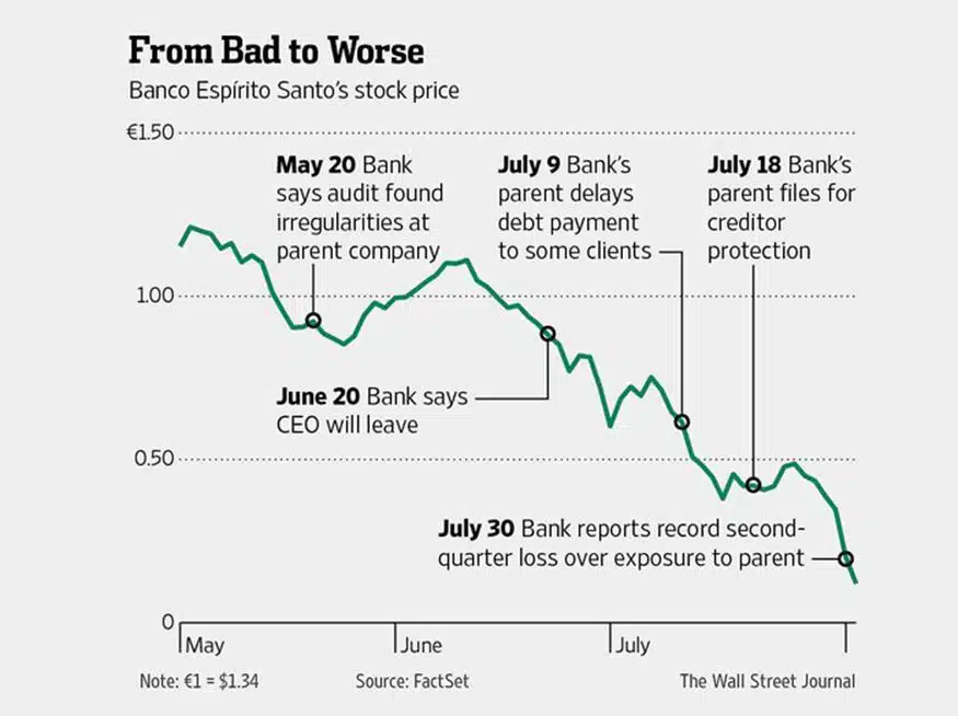 In mei van dit jaar raakte de financiële wereld lichtelijk gealarmeerd. Het bleek dat de financiële groep Espirito Santo International, gevestigd in Luxemburg, gesjoemeld had met de cijfers. De tweede bank van Portugal, Banco Espirito Santo (BES), was een volle dochter van deze financiële groep. BES had niet alleen veel leningen verstrekt aan het moederbedrijf, maar ook een groot deel van het schuldpapier verkocht aan haar eigen clientèle.