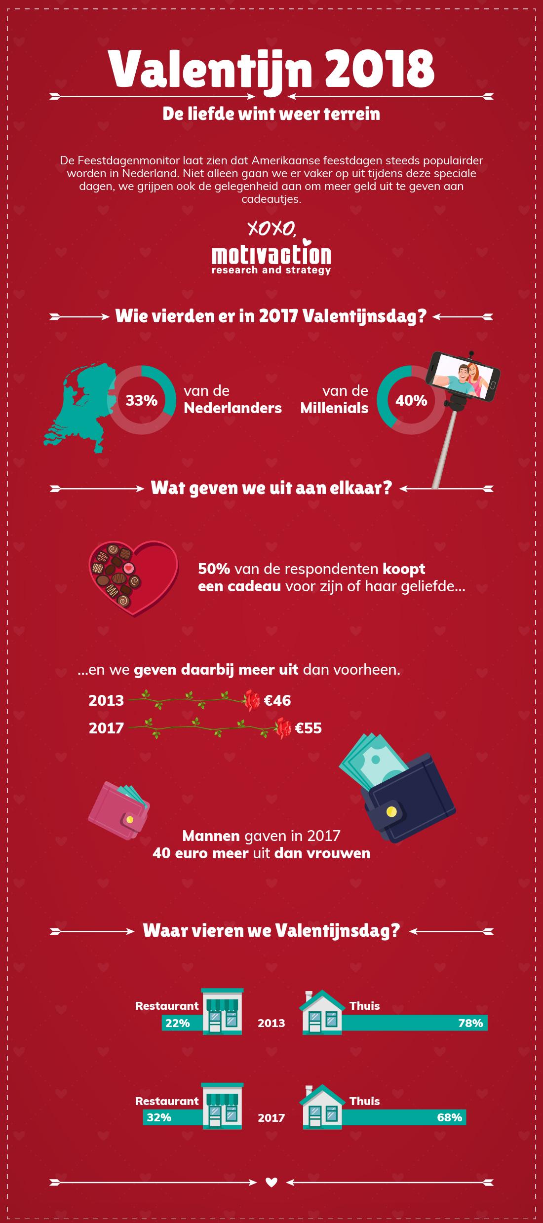 Één op de drie Nederlanders vierde op 14 februari 2017 de dag des liefde en deze feestvierders gaan steeds meer uitgeven. In 2013 lag het gemiddelde rond de 46 euro, terwijl we vorig jaar op 55 euro uitkwamen. Millennials – mensen die geboren zijn tussen 1980 en 2000 – zijn het meest bezig met Valentijn (40%). Dit blijkt uit de trends van de jaarlijkse feestdagenmonitor van Motivaction onder 1.500 Nederlanders, uitgevoerd sinds 2013.