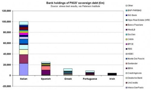 Zoals u kunt zien is de “exposure” van financiële instellingen in Italië vele malen groter dan in de andere zogenaamde “PIIG” landen. Het is te hopen dat de Italianen onder hun staatskas een beter fundament hebben dan de toren van Pisa.