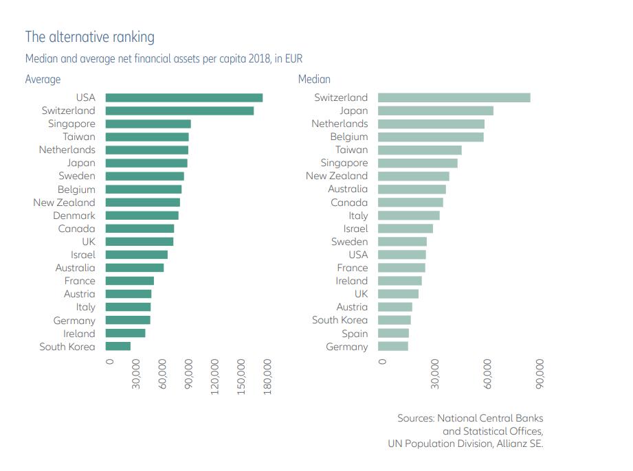 De totale wereldwijde activa daalden met 1,9 procent tot bijna 130 biljoen euro, deels als gevolg van een aanzienlijke vertraging in China. De Amerikanen hebben met een netto vermogen per hoofd van de bevolking van 184 410 euro de Zwitsers van de troon gestoten (173 840 euro). Daarachter staat Singapore op 100.380 euro, vóór Taiwan en Nederland op 97.850 en 97.345 euro.